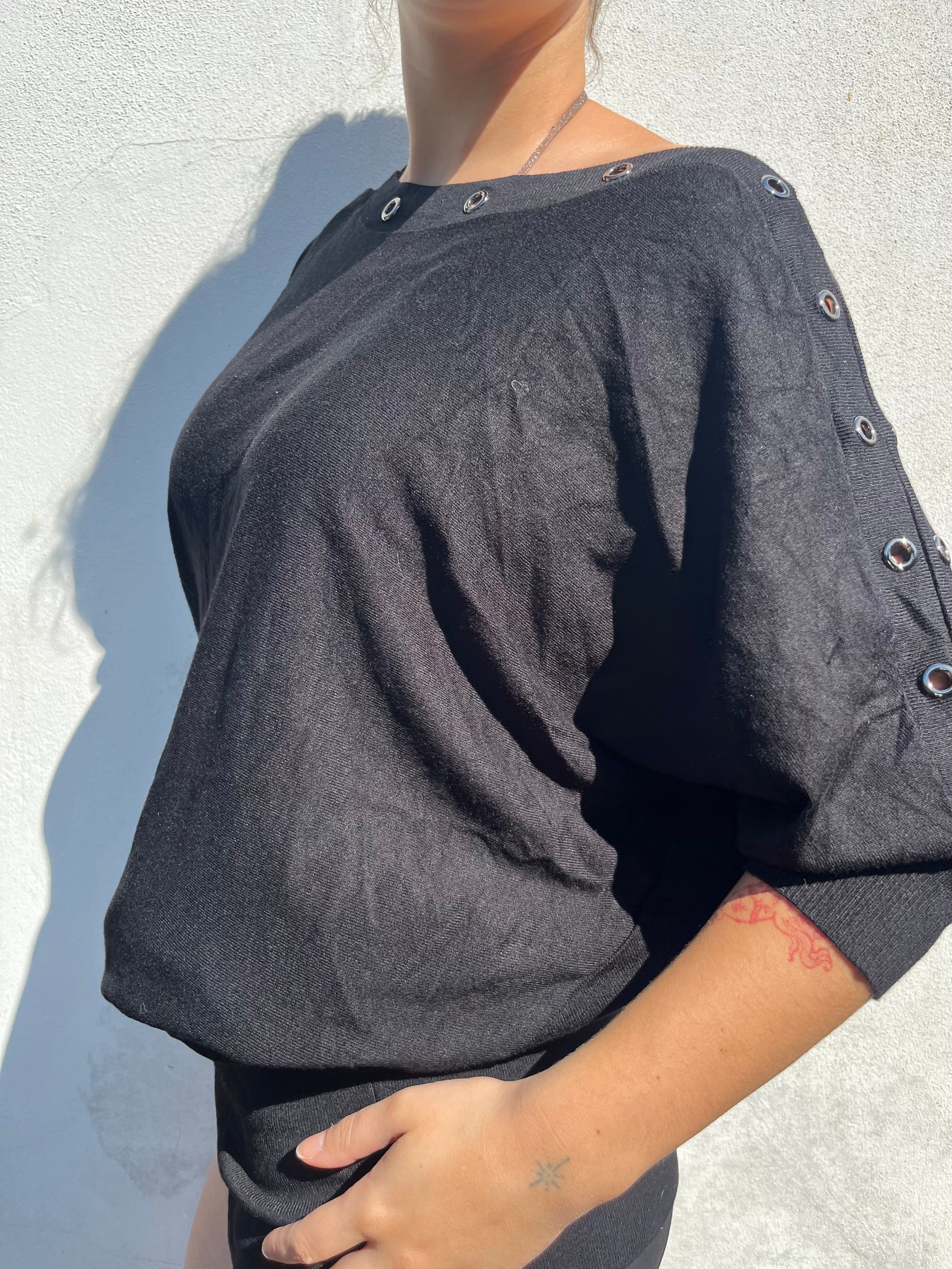 Black double layered knit. It features cuffed waistband and sleeves, and silver eyelet detailing on the arm and neckline.
