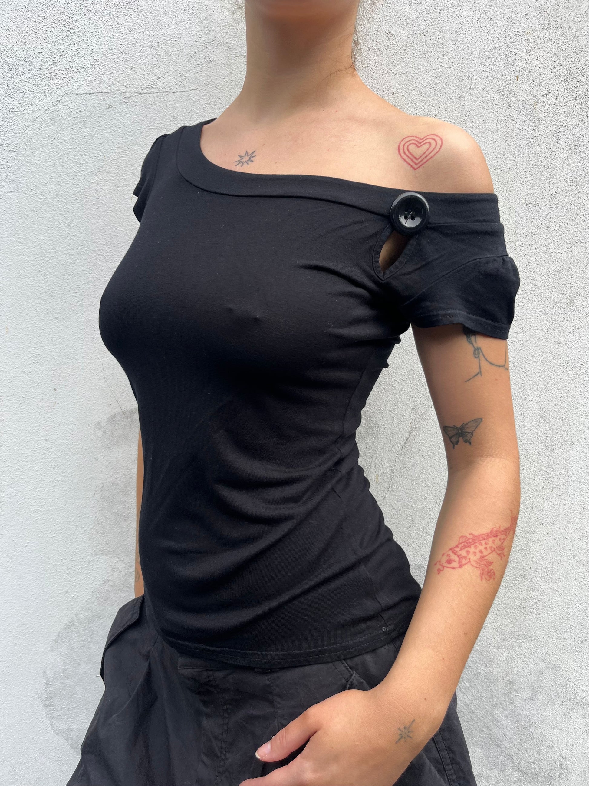 Black top with cuffed sleeves and button detail. Can be worn on or off the shoulders.