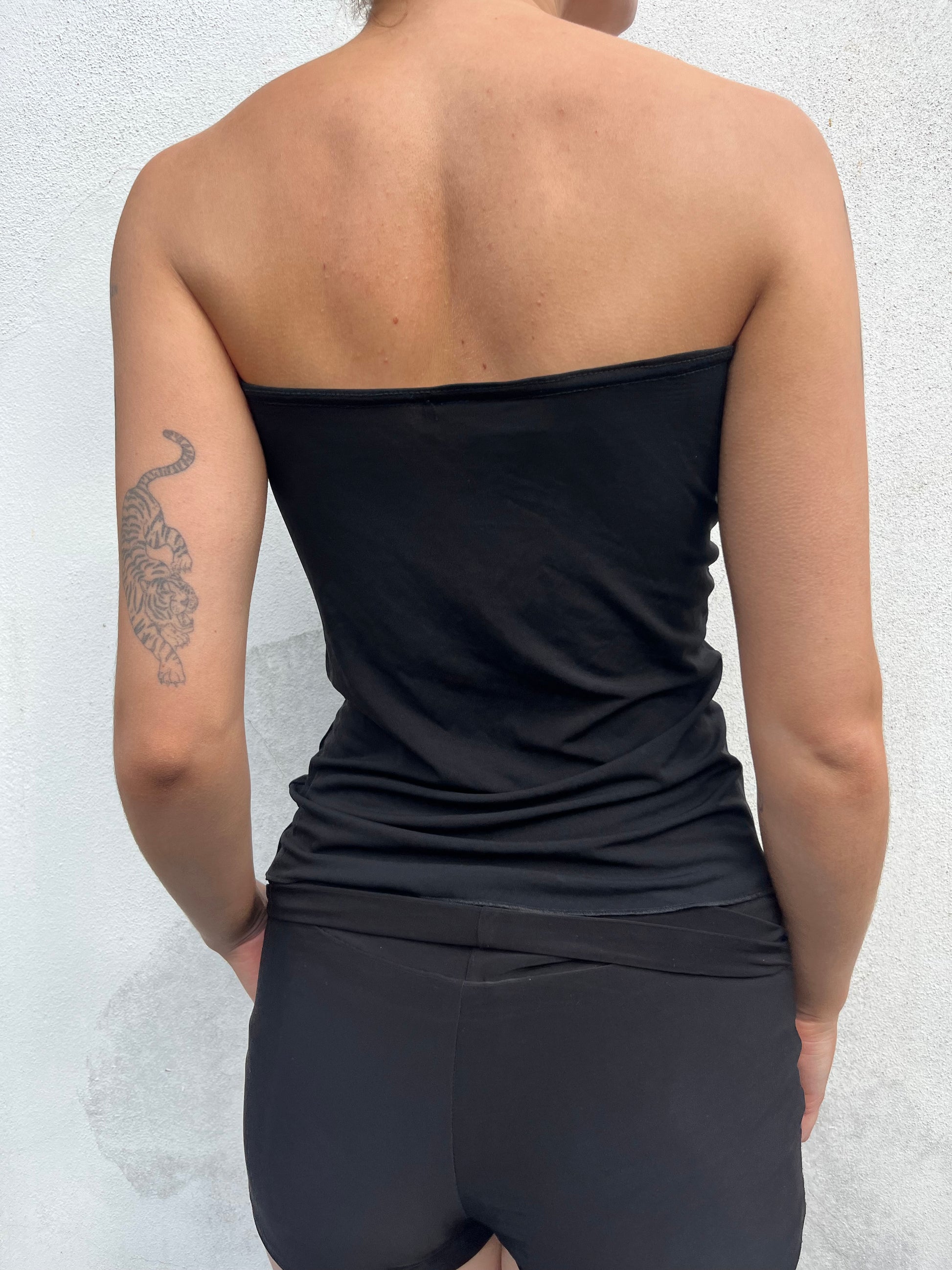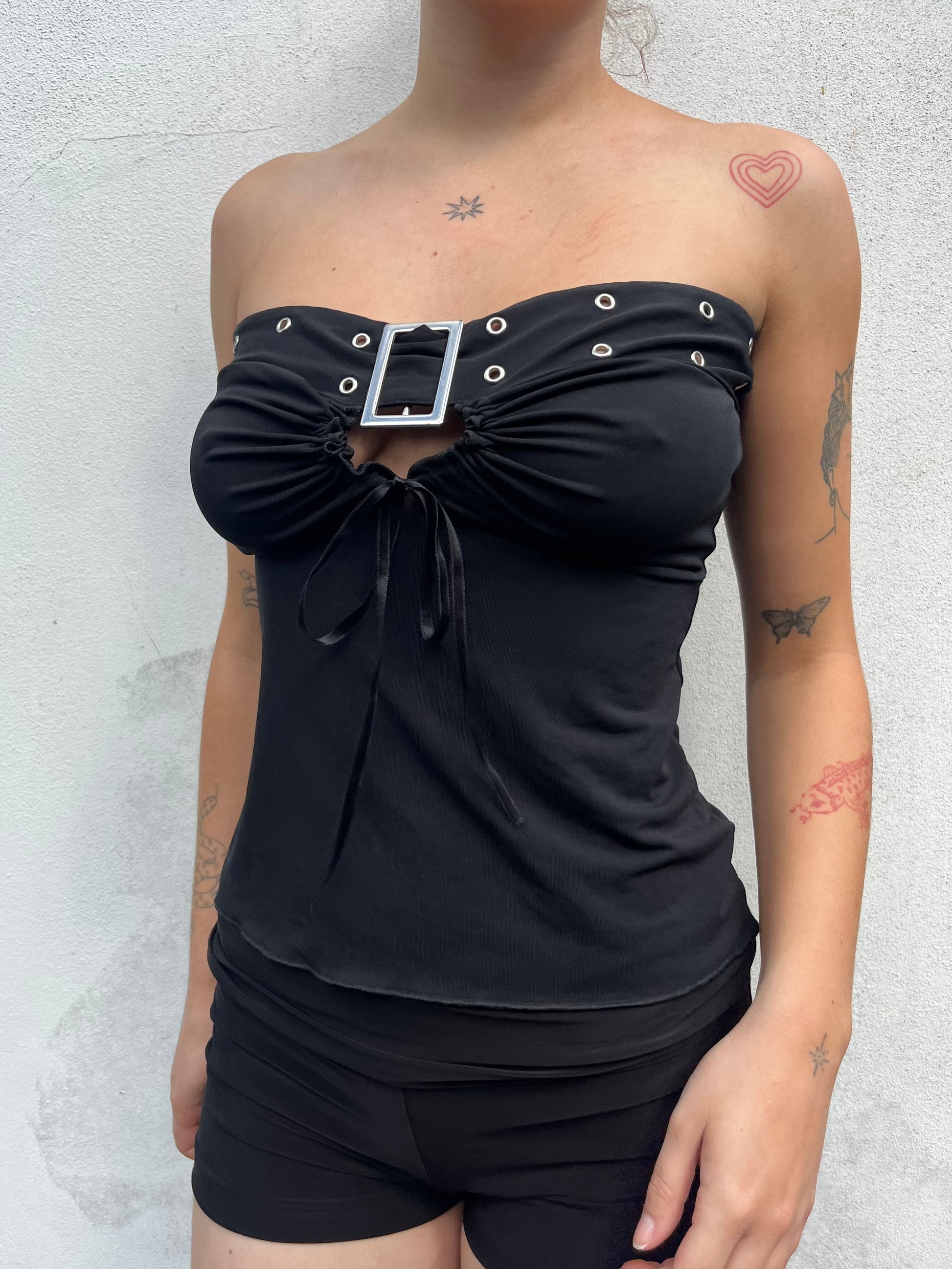 Black tube top with eyelet buckle and keyhole detail.