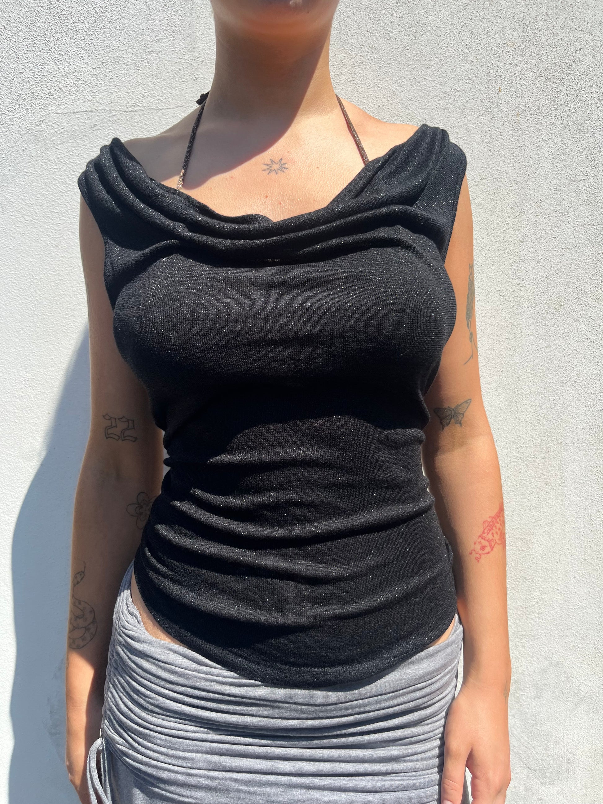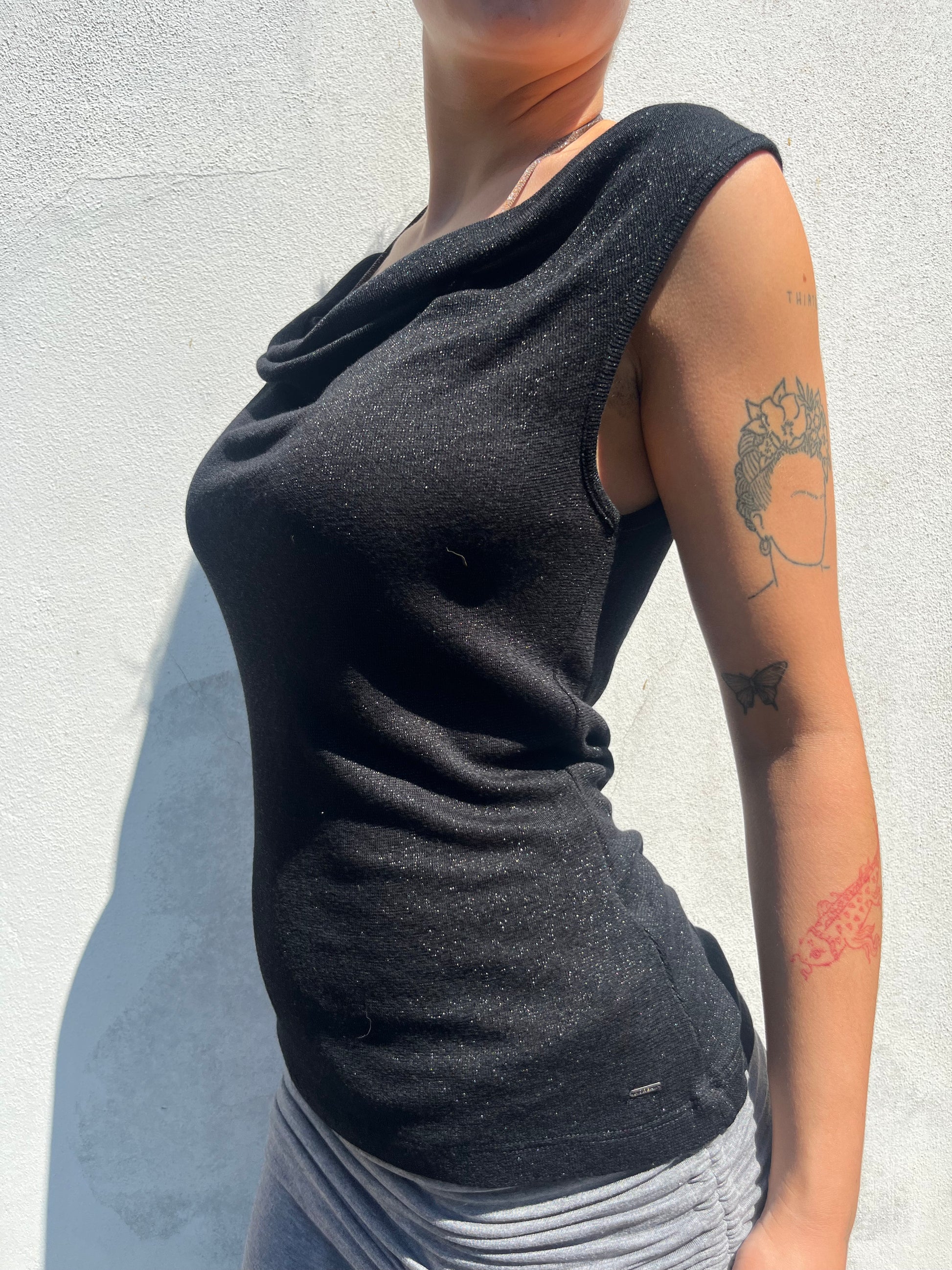 Vintage slouchy black top in a fine knit material from Morgan De Toi. The material has a subtle sparkle to it. Can be worn as a cowl neck or on the shoulders.