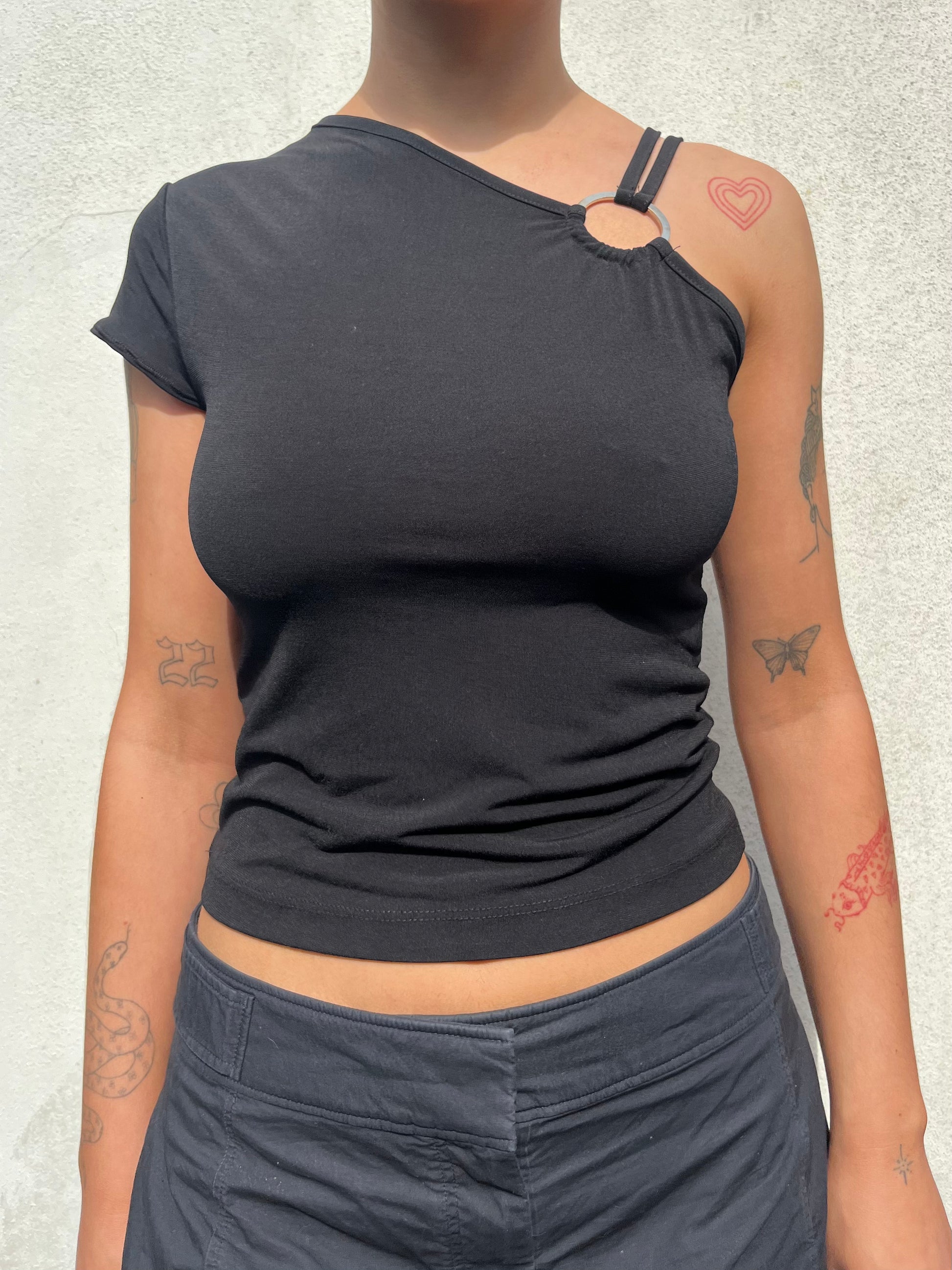 One shoulder top with cap sleeve on one side and o ring on the other.