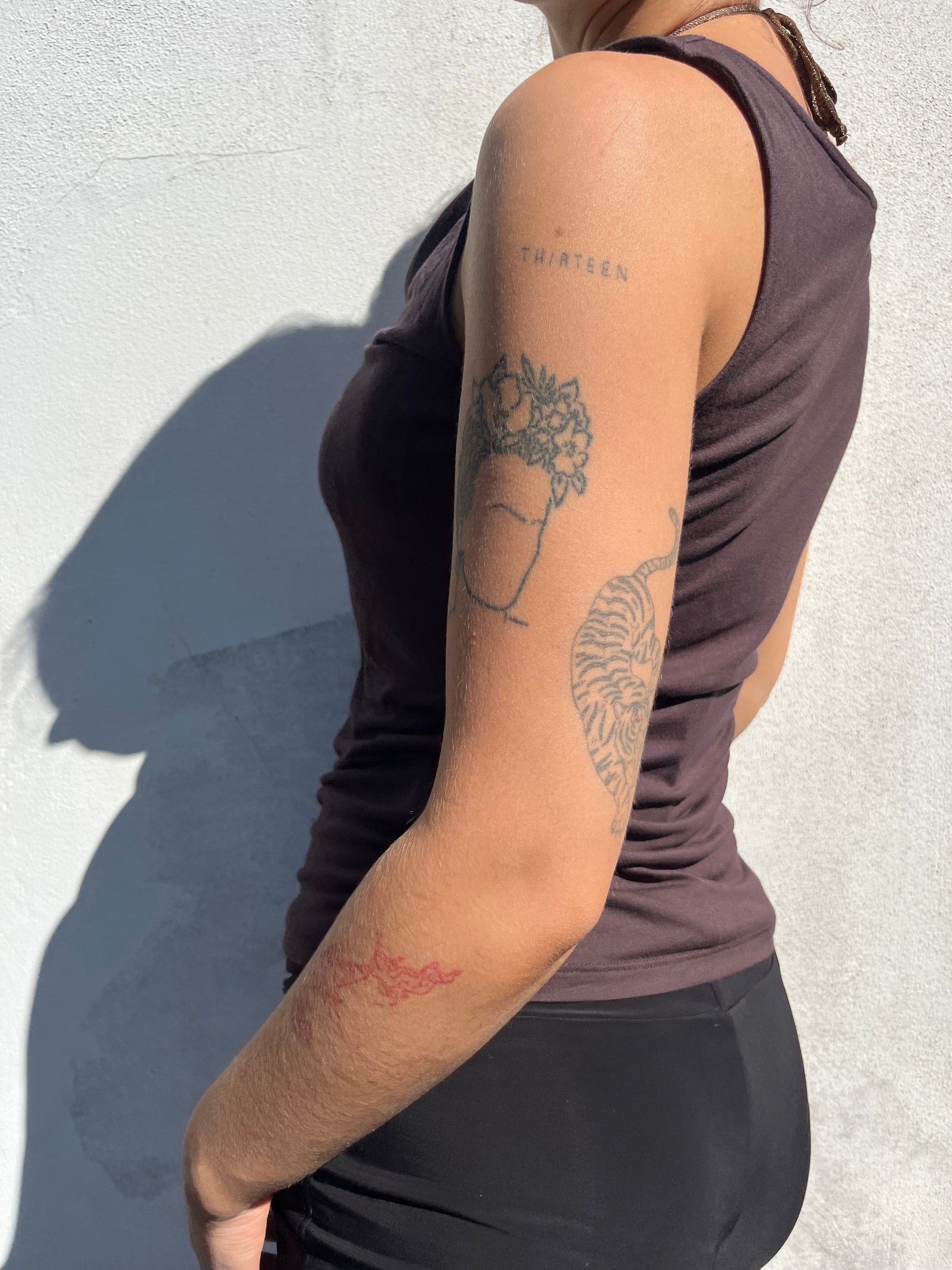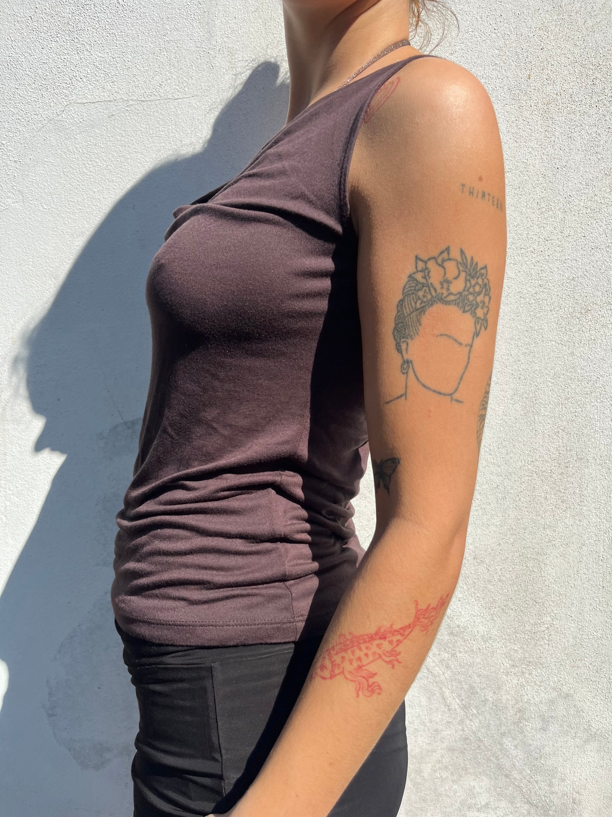 Chocolate brown cowl neck top which can be worn on or off the shoulders.