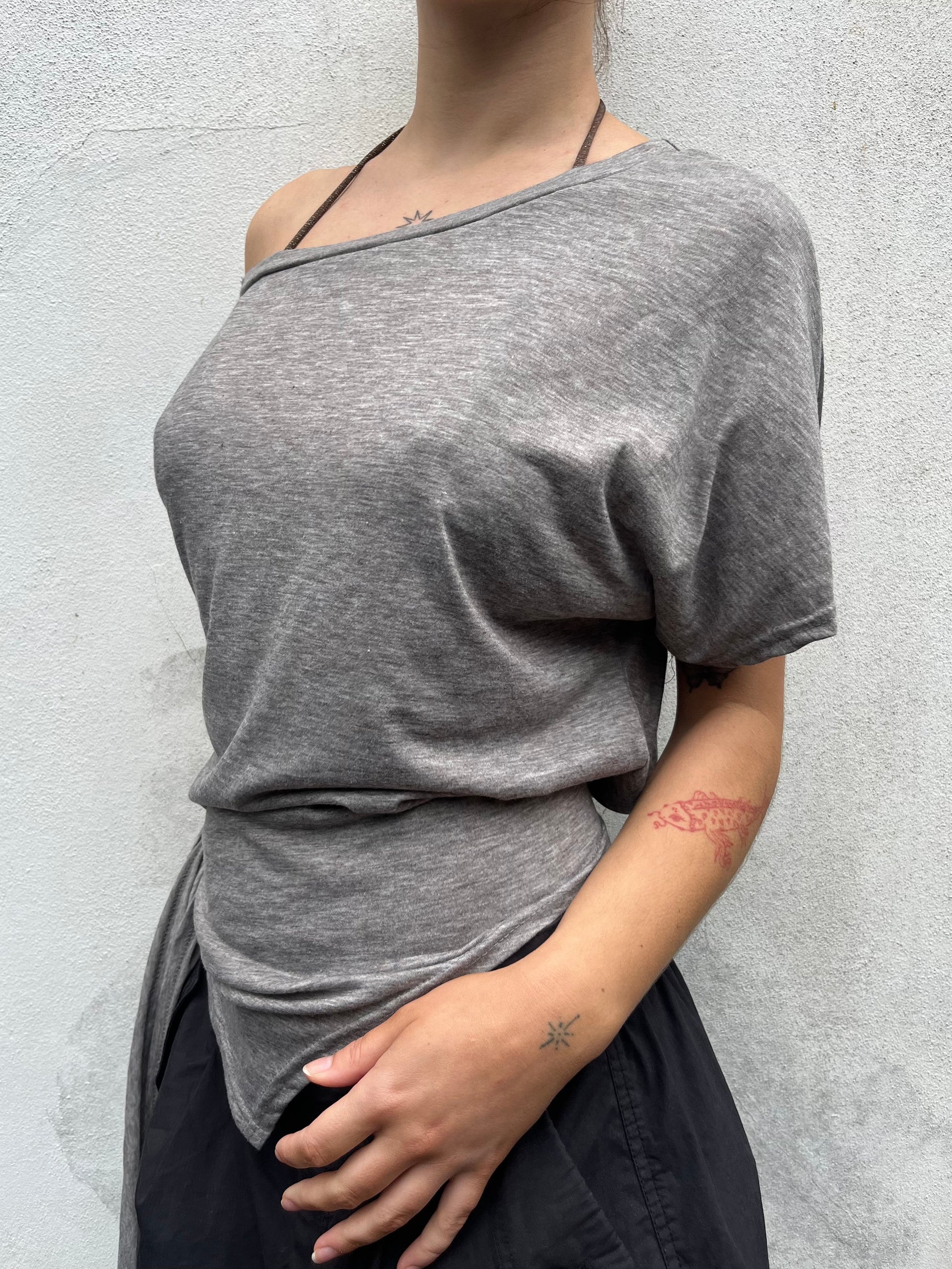 Grey t shirt with an asymmetrical hemline and wrap tie detail. Can be worn a few different ways.
