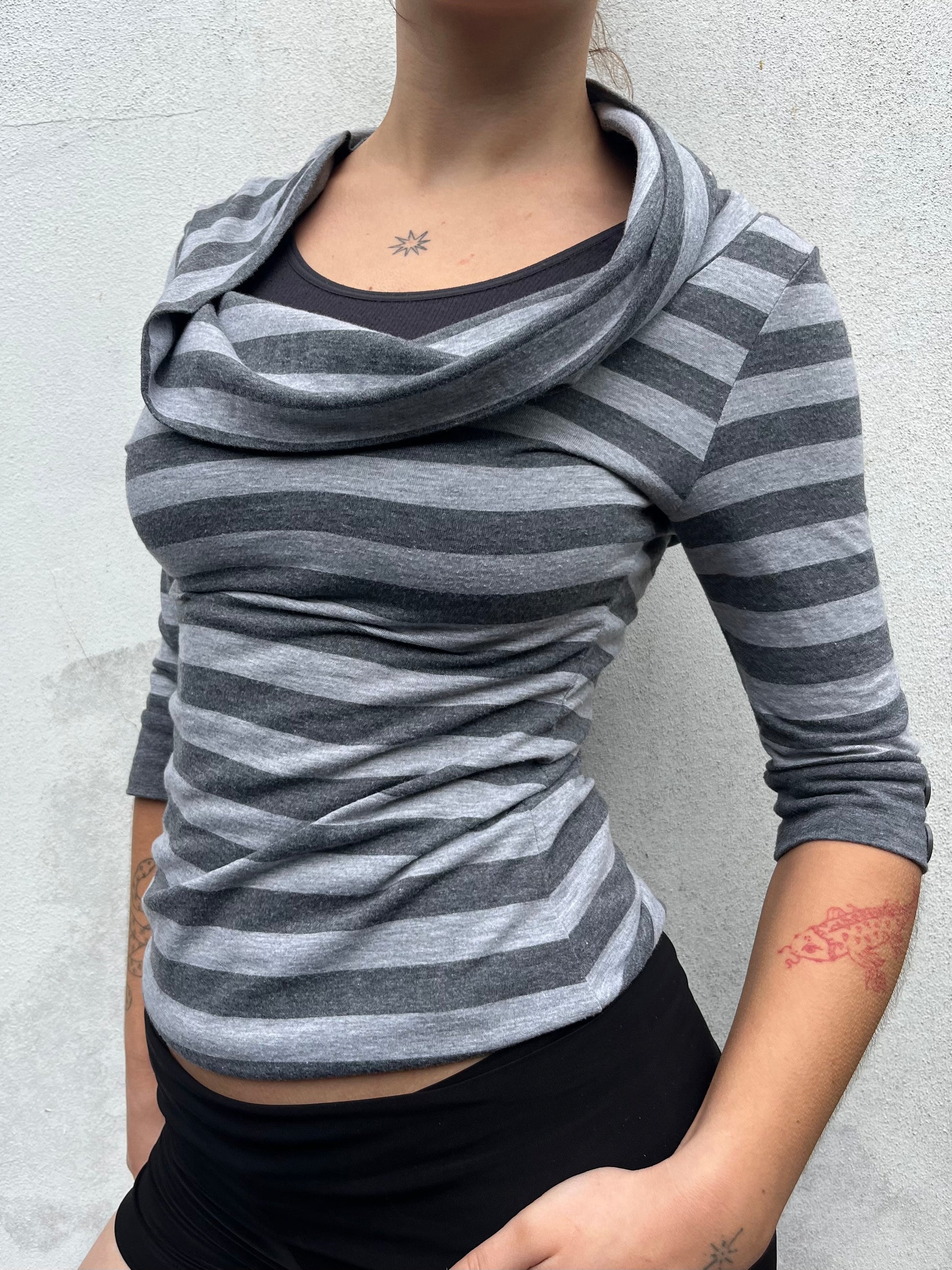 Two tone grey top with 3/4 sleeves, a slouchy cowl neckline that can be worn on or off the shoulders, and button detailing on the sleeves.