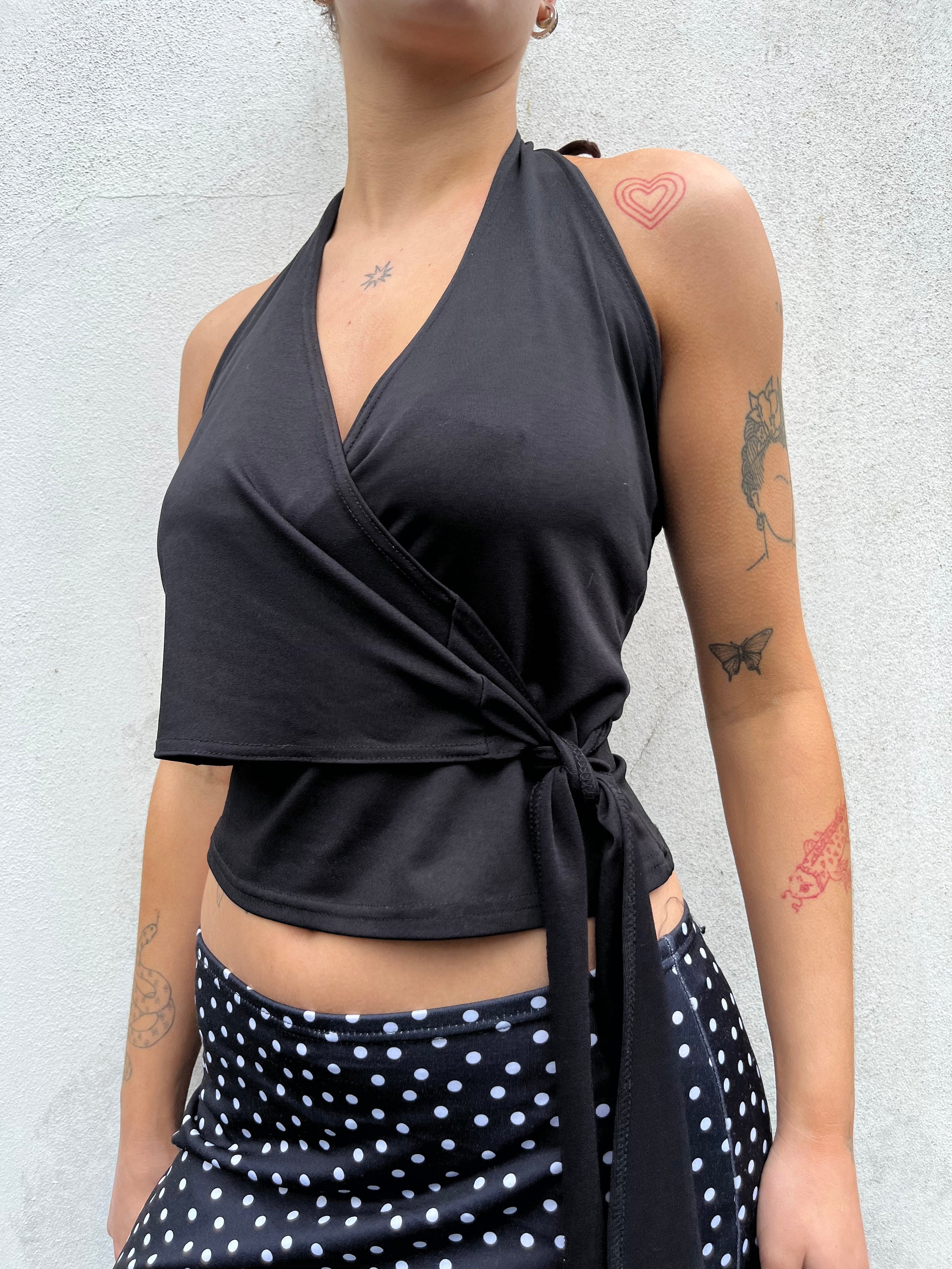 Vintage black halter neck top. It features asymmetric cross over fabric that can be tied looser or tighter.