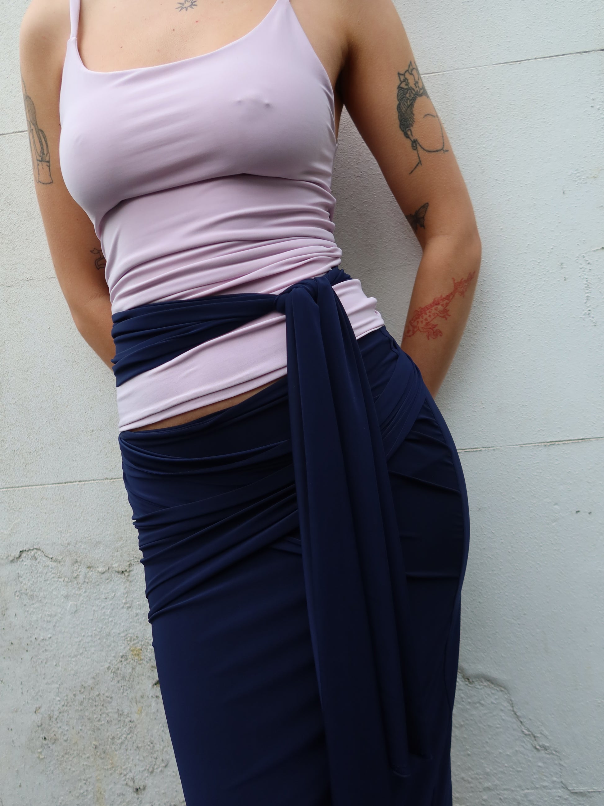 Multi wear skirt in a midi length made with double lined fabric for support, and two long layers of fabric that can be pulled and moved to different positions. The two long pieces are kept as the total width of the fabric roll so you can cut them to your preferred length, or keep them long to wrap around a few times!