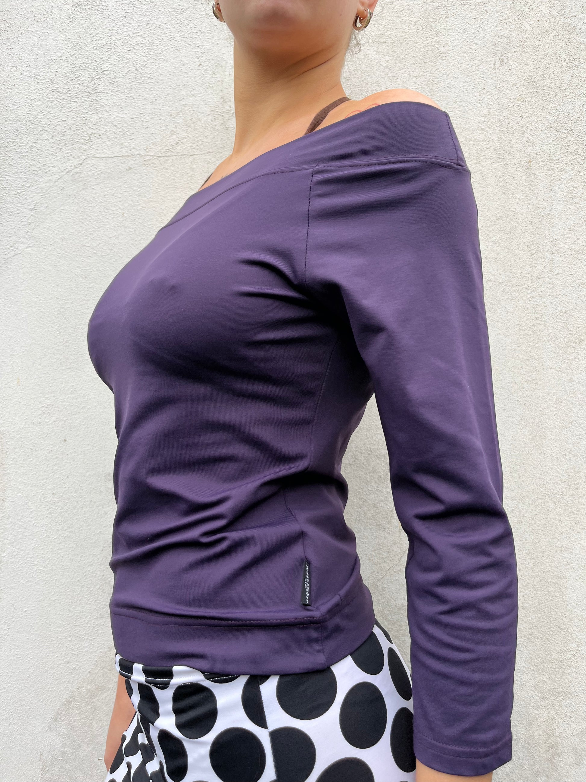 Vintage purple off the shoulder top. It features slinky material and 3/4 length sleeves. It can be worn on the shoulders too for a more slouchy look.