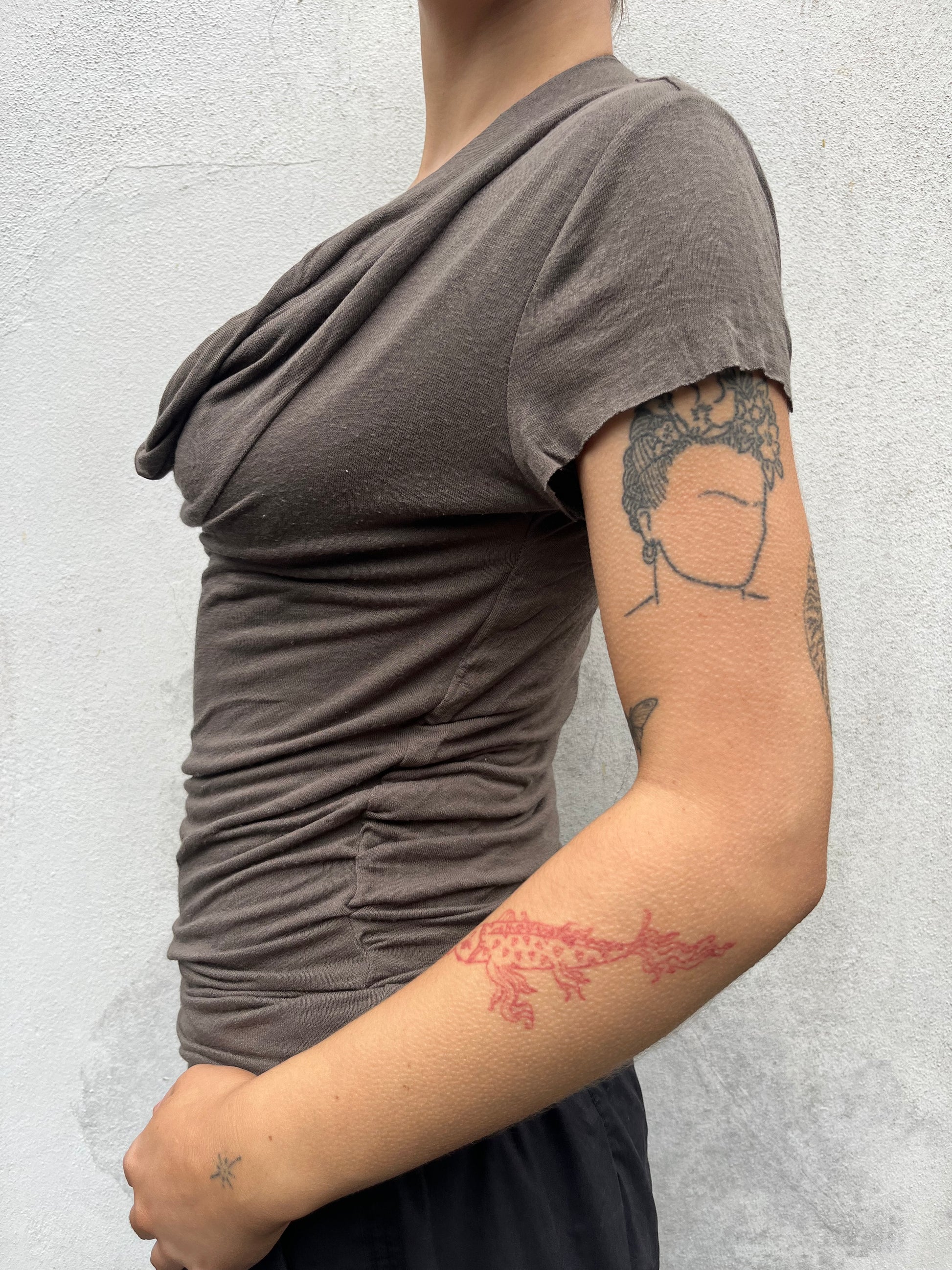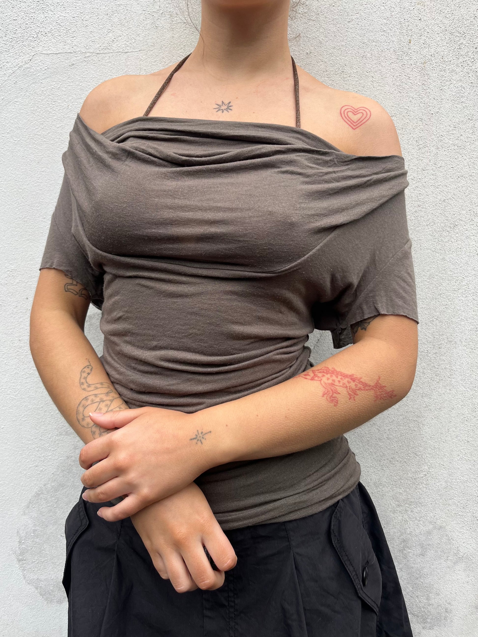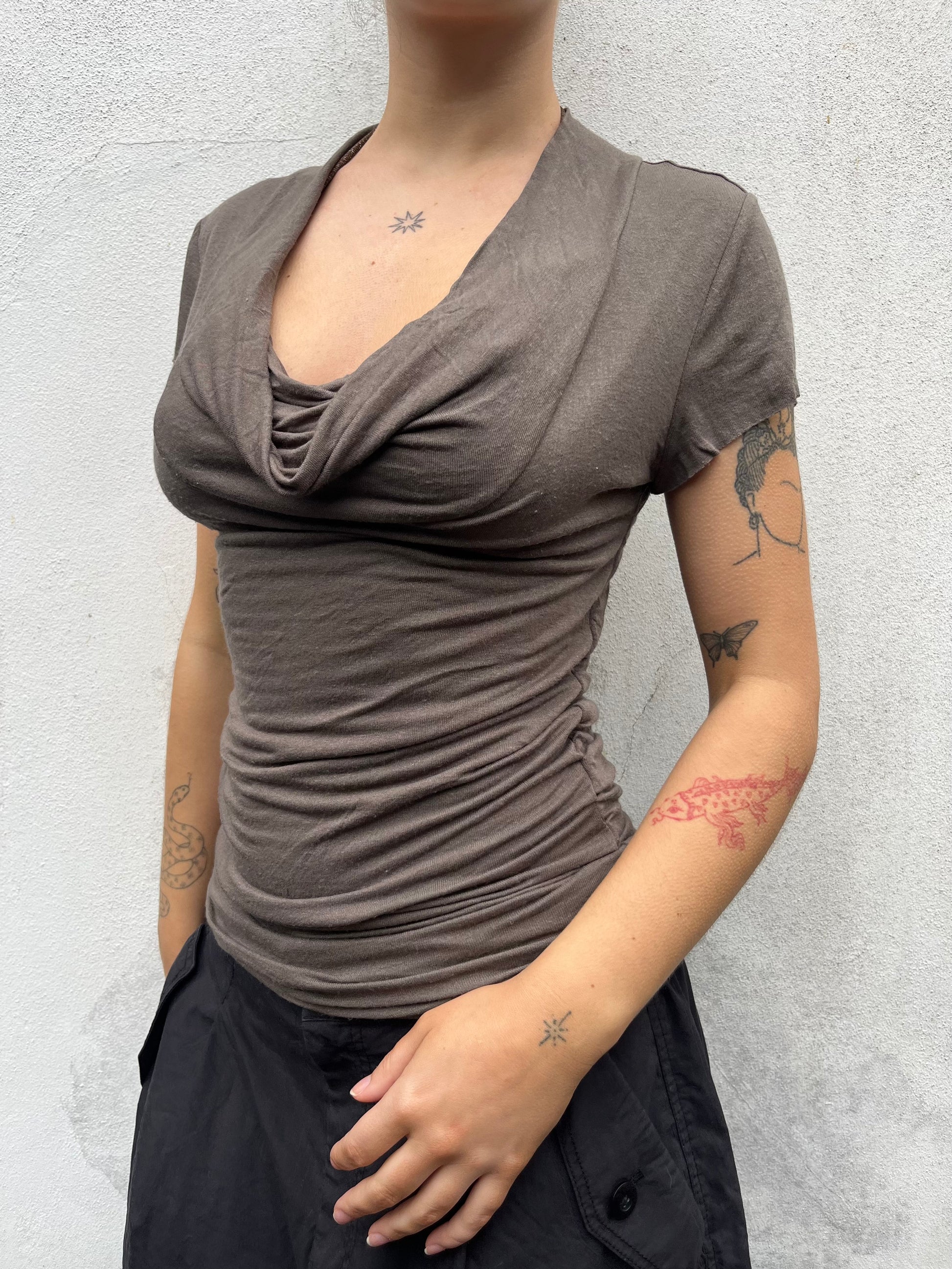 Vintage khaki top made from double lined material. It features a slouchy cowl neckline.