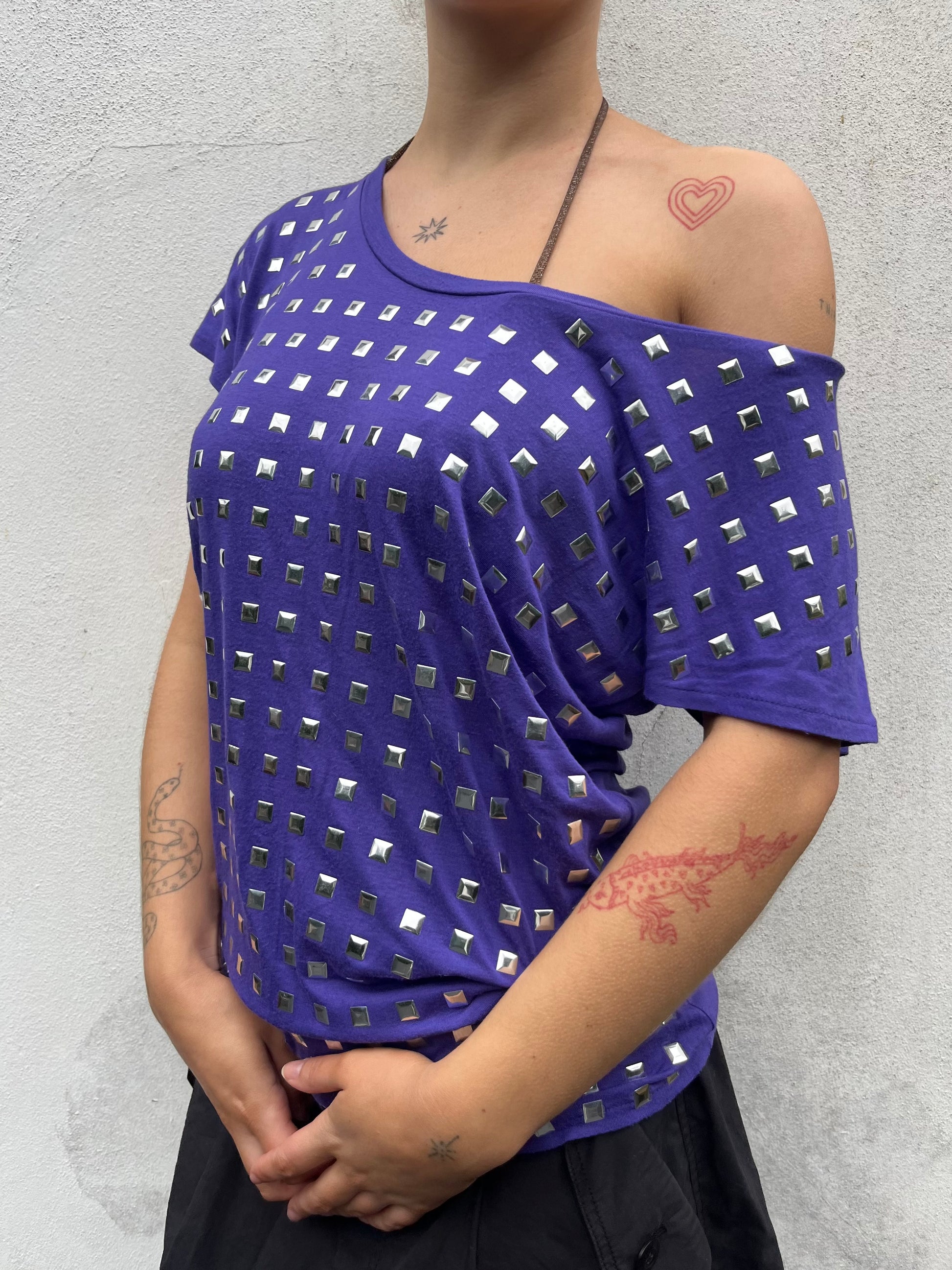 Vintage purple top with silver square studs. Can be worn in a slouchy, asymmetrical way.