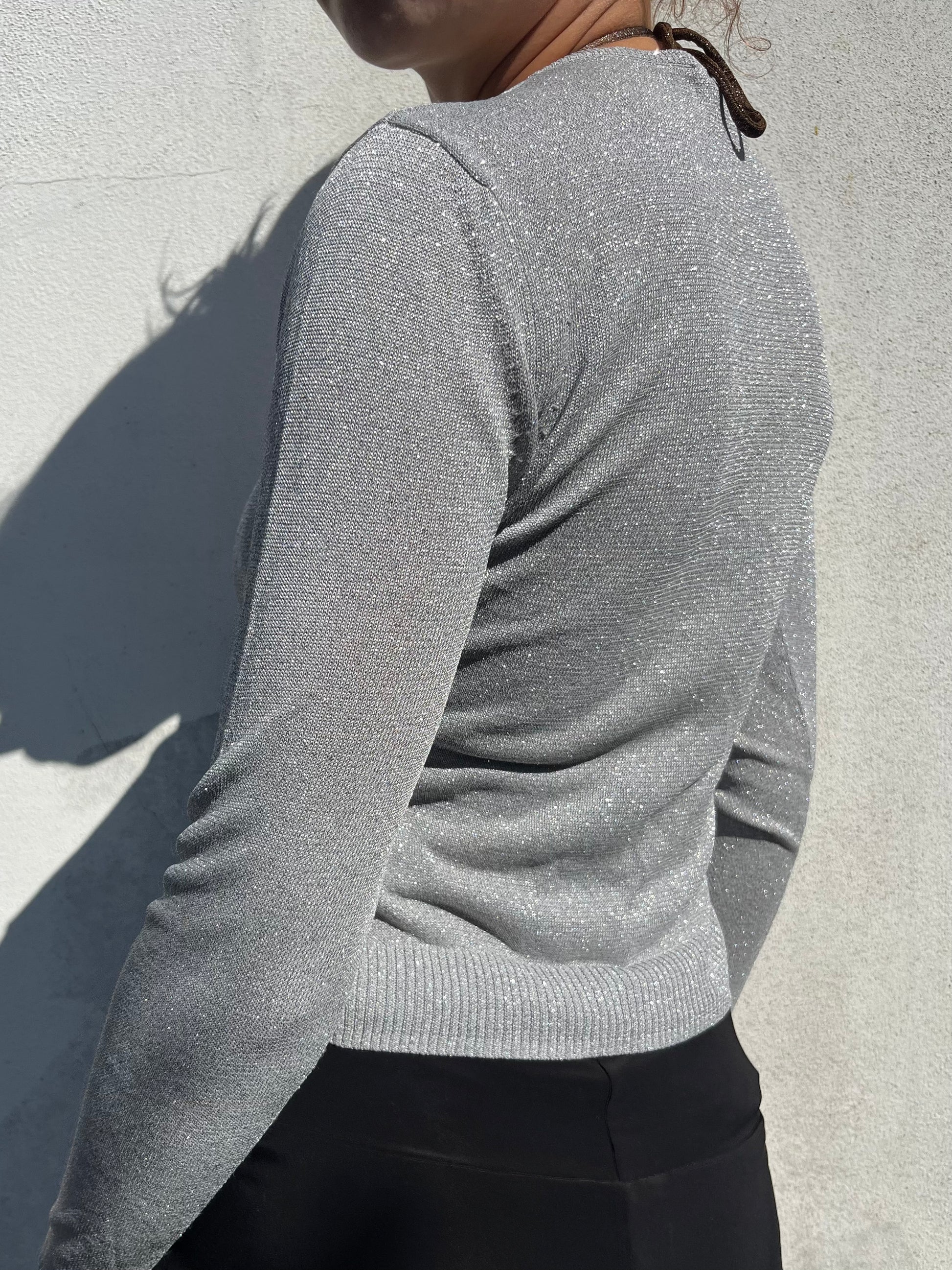 Silver cardigan top in a light knit material. It features a button down front. Has some light marks that will likely come out in a wash.