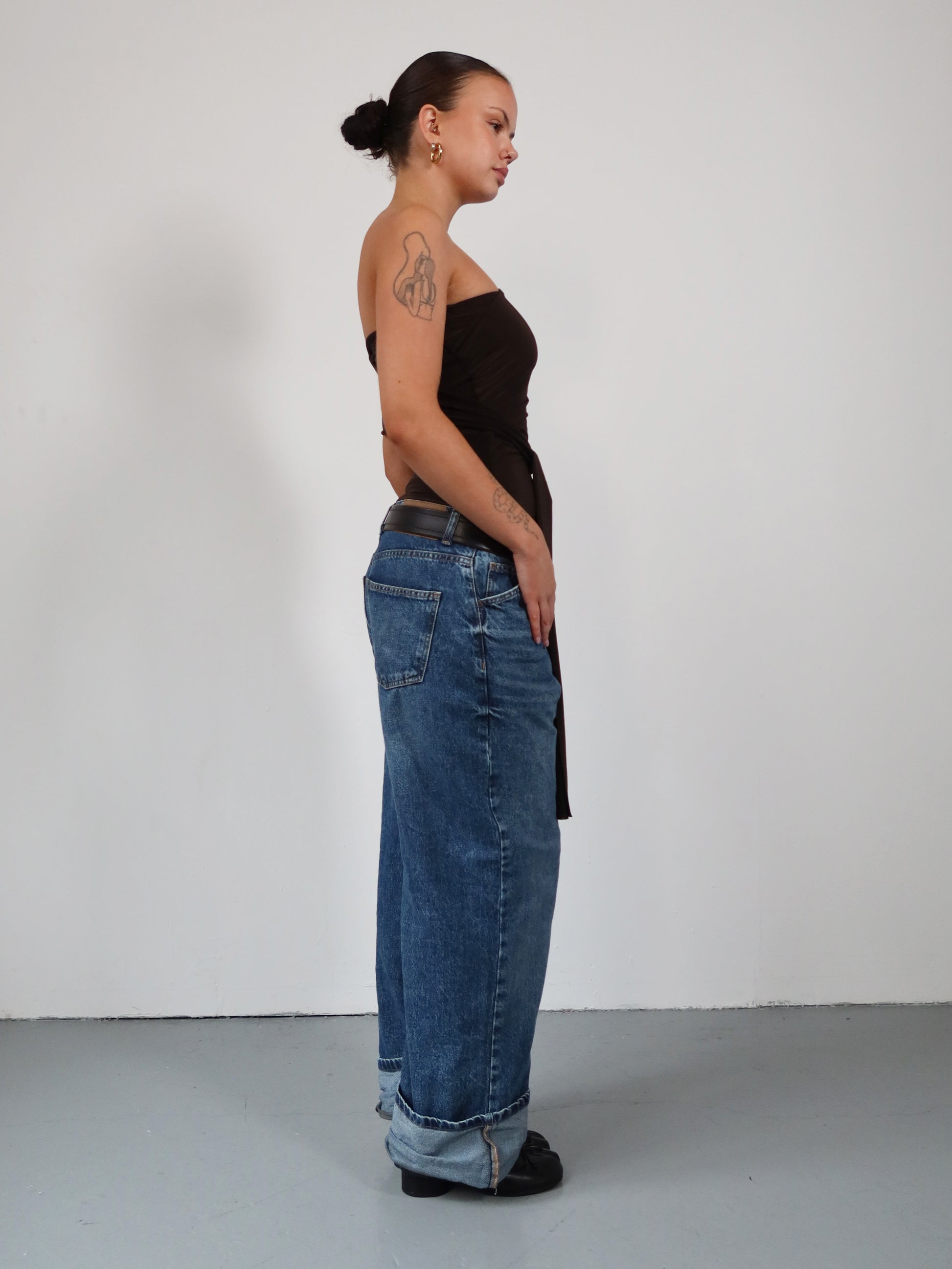 Multi wear top with a double lined tube for support and coverage, and two long layers of fabric that can be pulled and moved to different positions.