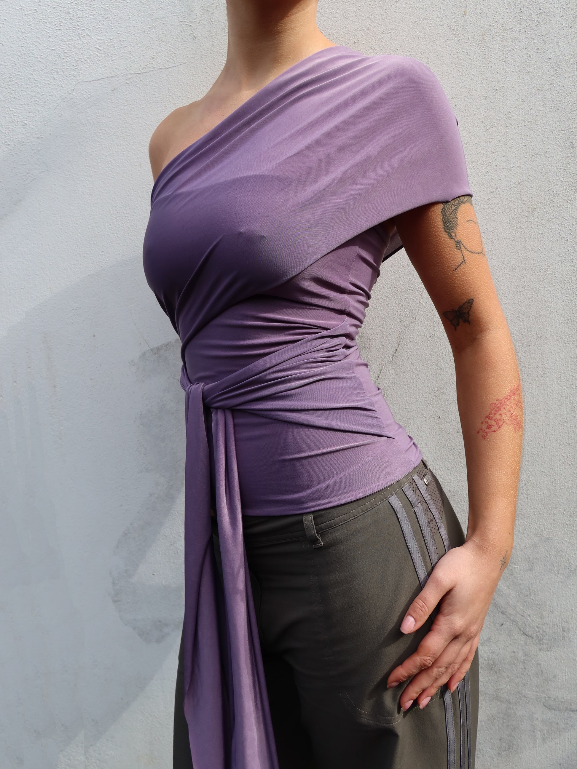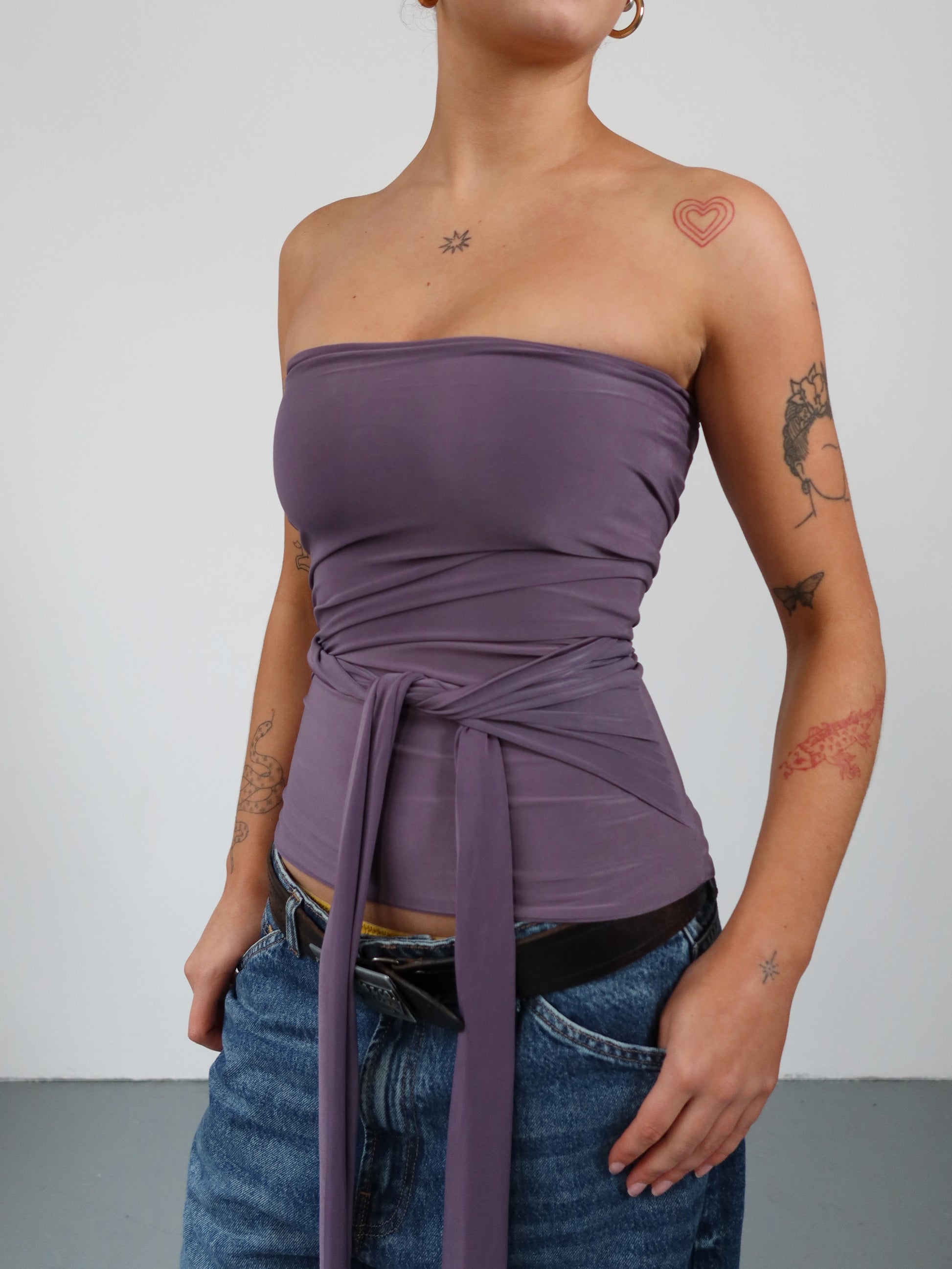 Multi wear top with a double lined tube for support and coverage, and two long layers of fabric that can be pulled and moved to different positions.