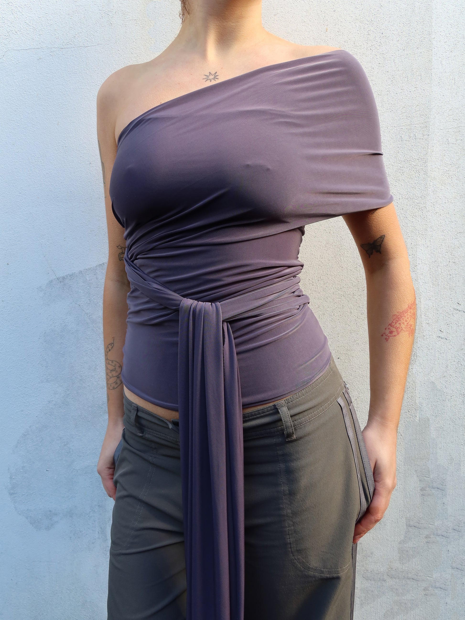 Multi wear top with a double lined tube for support and coverage, and two long layers of fabric that can be pulled and moved to different positions.